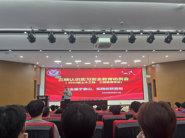 2025年9月1日-5日, 2024级土木工程、工程管理专业150名学生在湖北宜昌进行了为期5天的专业认识实习。为确保本次实习的顺利开展,8月31日,开展了专业安全教育动员,明确了实习行程安排,强调了实习纪律和安全。