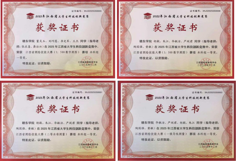 近日,江西省高等教育学会公布了2025年江西省大学生科技创新竞赛测绘技能大赛成绩,赣东学院应用工程学院2支参赛队伍分别角逐“一级导线测量”“1:500数字测图”“二等水准测量”赛项,获一等奖4项、二等奖1项、三等奖1项。