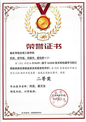 近日,由中国测绘学会主办、易智瑞公司承办的“易智瑞杯”2025中国大学生GIS软件开发竞赛落幕。赣东学院遥感科学与技术专业大二学子首次参赛即获突破,获二等奖、三等奖各1项。