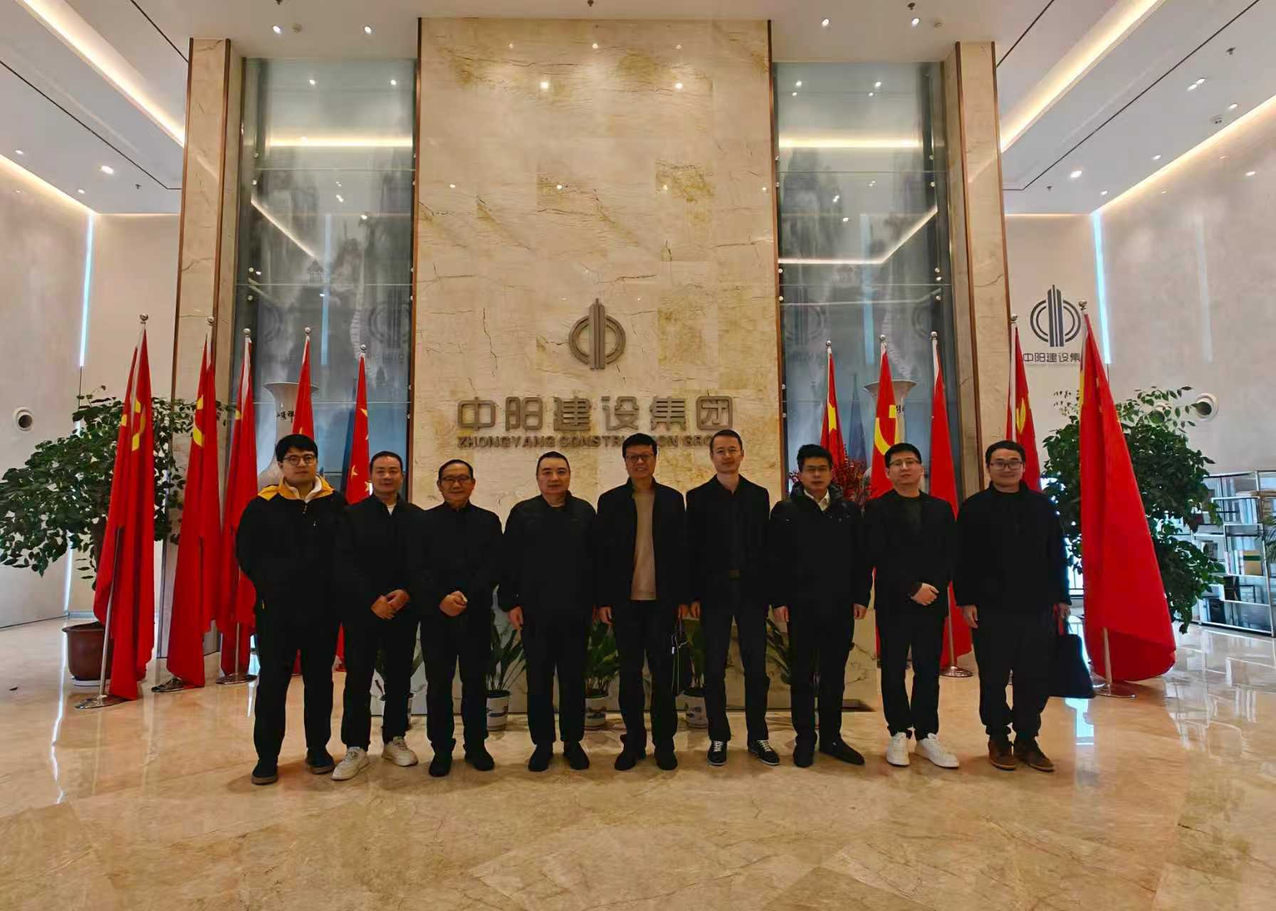 在中阳建设集团,集团副总裁朱旻、黎海峰,研究院院长彭雄,研砼总经理蒋思朋等陪同参观并座谈。胡鹏院长一行首先参观了研发中心及办公环境,直观感受企业在智能建造、绿色建材、工程管理等领域的创新成果与发展实力。随后双方围绕企业发展历程、业务布局、未来战略规划展开深入探讨,并就校企共建实习实训基地、联合培养复合型人才、推动产学研成果转化等议题达成多项共识。