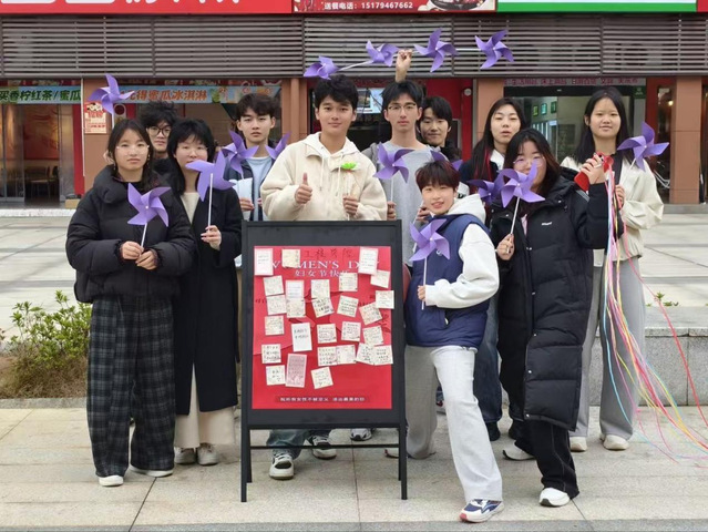 活动现场热闹非凡,摆放着精心准备的各色制作材料。在工作人员的讲解与指导下,同学们从挑选组装风车叶片开始,绘制图案,再用工具固定,每一个步骤都专注投入。当紫色的风车在指尖转动,仿佛将春日的灵动与活力尽数凝聚。“祝福展示栏”前,大家将对未来的期许与对他人的美好祝愿写于彩笺之上,裱上展板,让温暖的话语成为春日里最动人的“时间胶囊”。
