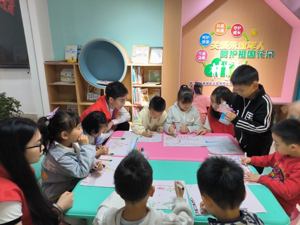 作为劳动实践的学生,在社区劳动服务点,学生志愿者一起陪伴幼儿园的小朋友们绘画、读书、写字,给小朋友们带来更多的乐趣。
