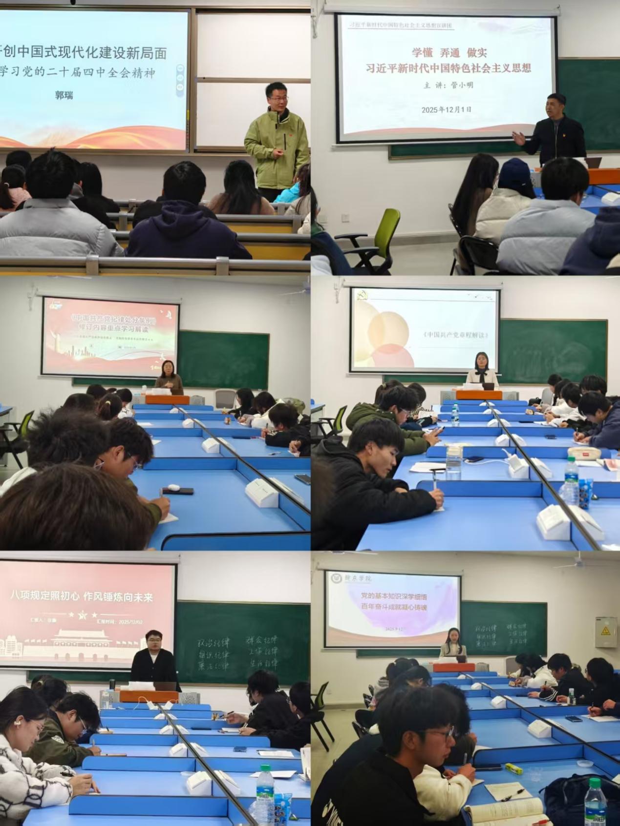 本期培训班专题辅导环节与机械与电子工程学院合班,11月30日晚,应用工程学院党总支副书记郭瑞主持了开班仪式,对培训班学员提出了学习要求,开班仪式后以《奋力开创中国式现代化建设新局面——学习党的二十届四中全会精神》授课,机械与电子工程学院党总支副书记管小明、两个学院相关党务干部喻静雯、高薇、徐鑫、张思怡分别以《学懂弄通做实习近平新时代中国特色社会主义思想》《中国共产党纪律处分条例解读》《中央八项规定及其实施细则》《中国共产党章程解读》《党的基本知识深学细悟,百年奋斗成就凝心铸魂》为主题进行了专题辅导。培训班还包含分组研讨、实践锻炼等多种形式,系统开展学习,强化学员思想淬炼与能力提升。